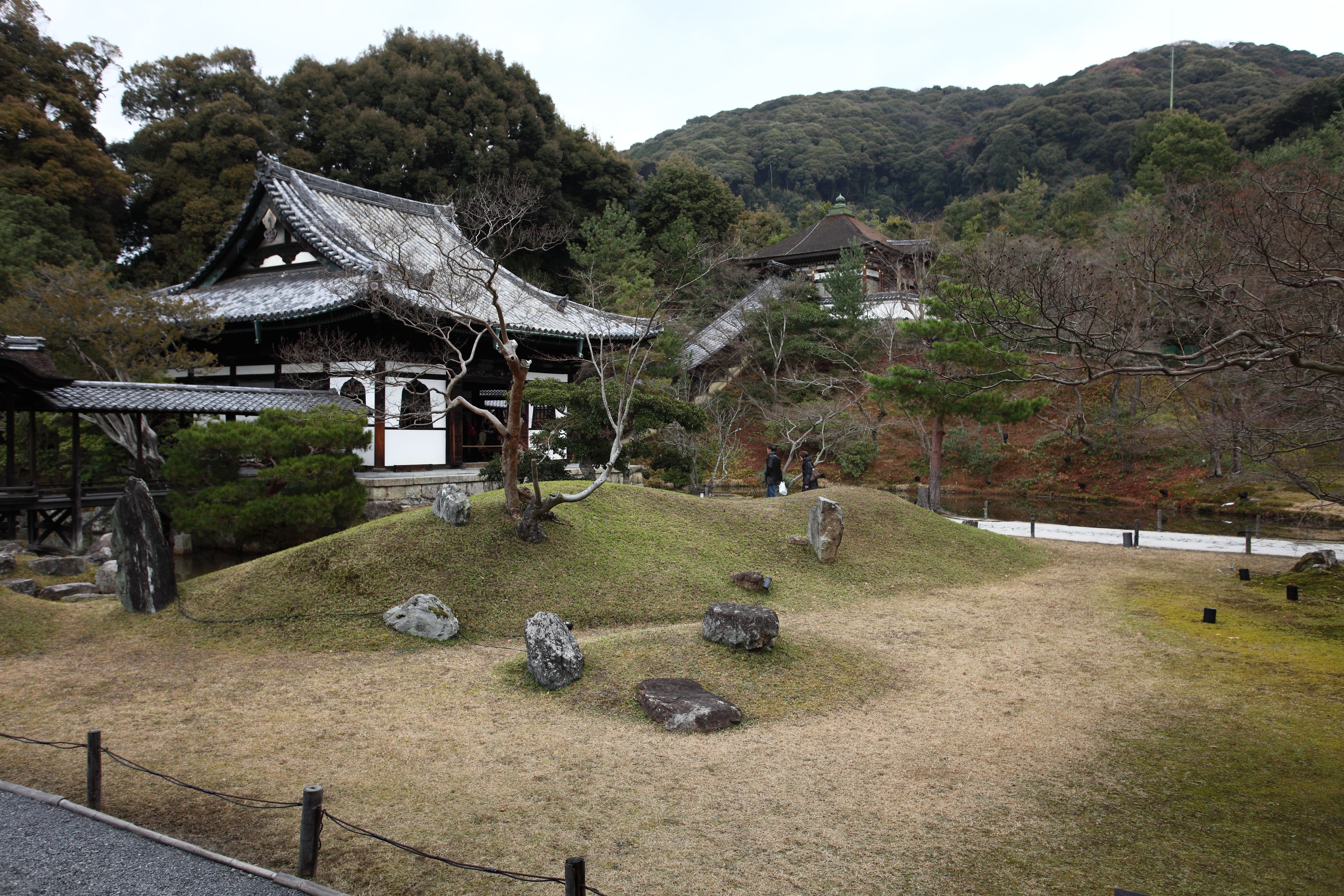 高台寺:開山堂(左)、霊屋(おたまや:中奥)、庭園(点前)、臥龍池(右奥の池)